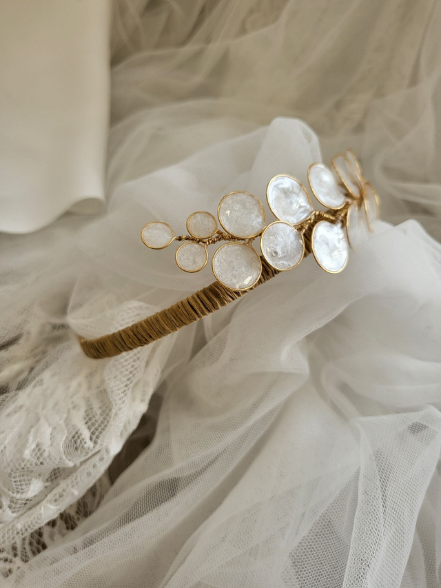 Imaginé pour accompagner la coiffure de la mariée tout au long de la journée, le serre-tête Bacchus apporte une dimension plus douce et poétique, grâce à ces formes rondes et généreuses rappelant les grappes de raison.
