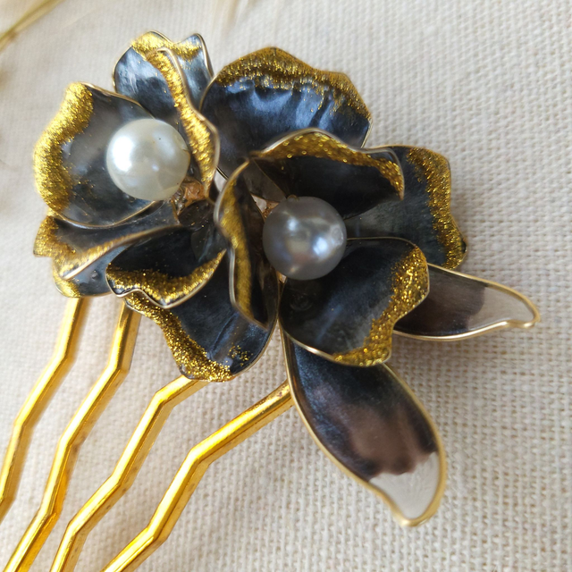 Accessoire de cheveux orné de fleurs en résine noire bordées de paillettes dorées et de perles, pour une coiffure chic et lumineuse.