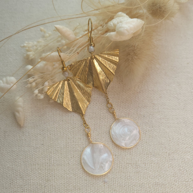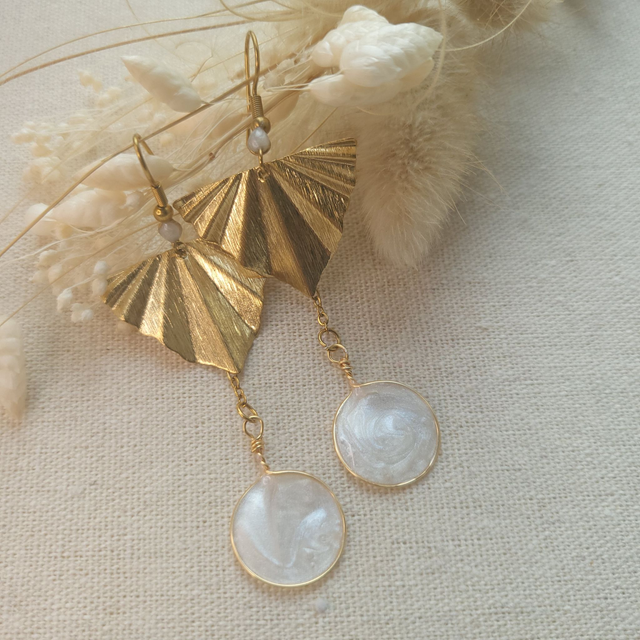 Boucles d'oreilles en résine nacrée, formes rondes façonnées et assemblées dans mon atelier.