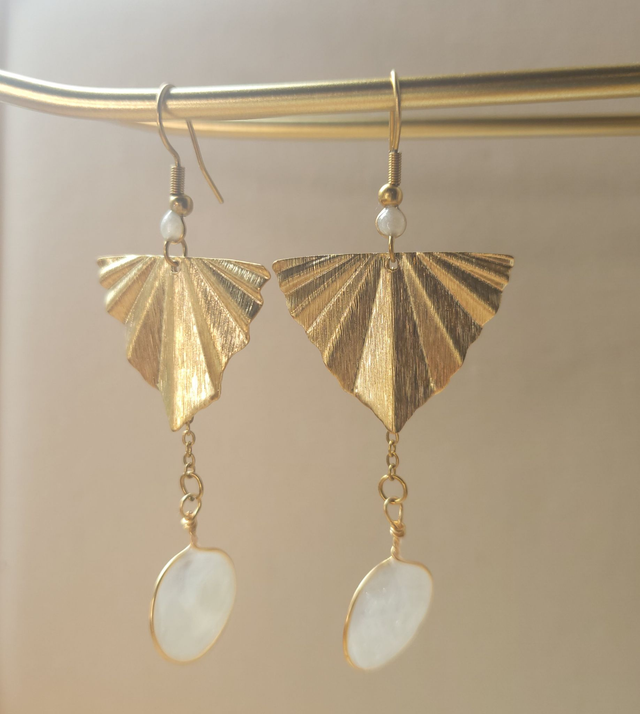 Matériaux : Fil de cuivre non ternissant, résine nacrée, breloques en laiton, boucles en acier inoxydable.