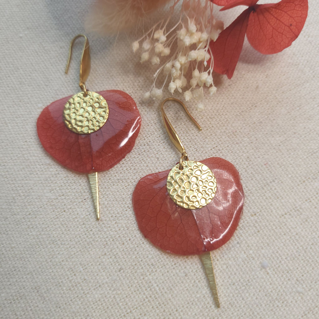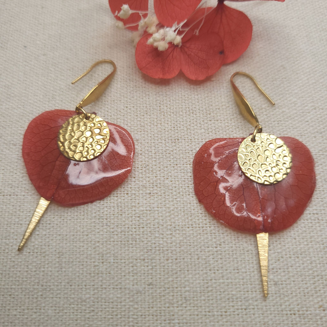 Les boucles d'oreilles sont fabriquées dans mon atelier avec des fleurs d'hortensia stabilisées trempées dans la résine ce qui lui apporte un effet brillant. Elles sont en acier inoxydable, les breloques sont en laiton.