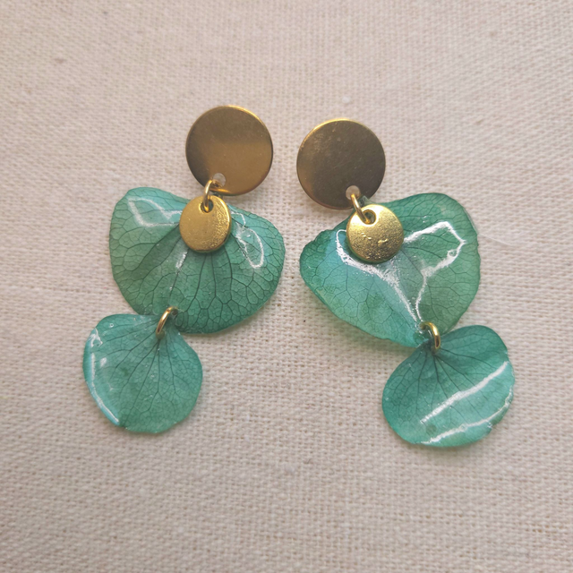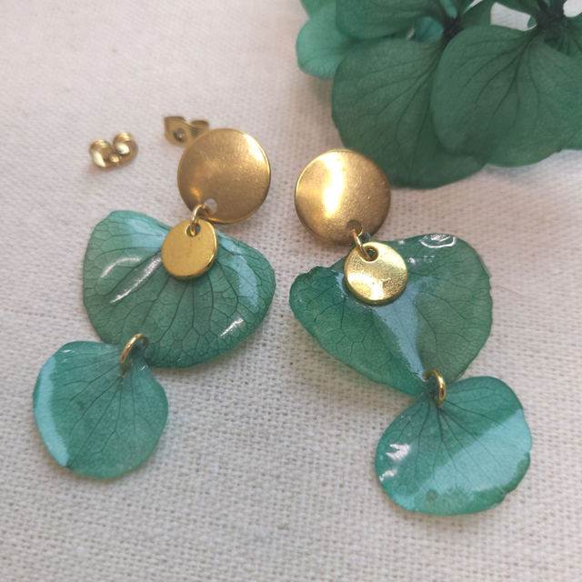 Les boucles d'oreilles sont fabriquées dans mon atelier avec des fleurs d'hortensia stabilisées trempées dans la résine ce qui lui apporte un effet brillant. Elles sont en acier inoxydable, les breloques sont en laiton.