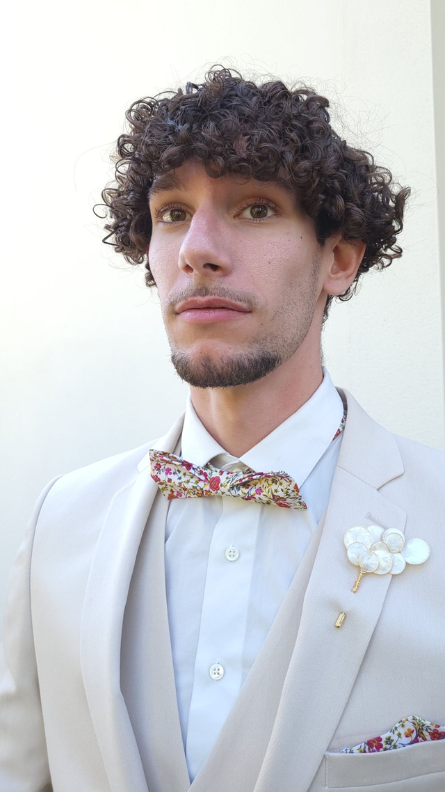 Réalisée à la main, elle se fixe simplement sur le costume et s'adapte aux tenues du marié ou des membres du cortège.