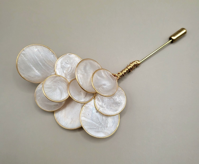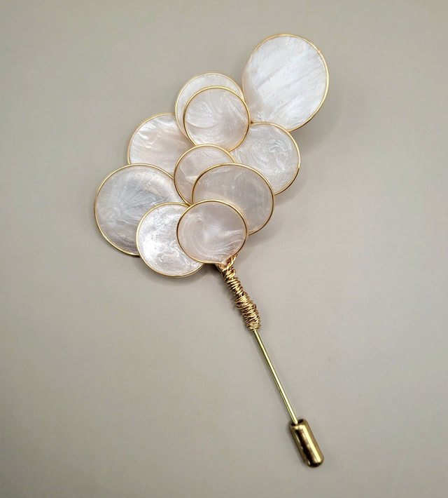 Matériaux : Fil de cuivre non ternissant, résine nacrée, boutonnière en métal