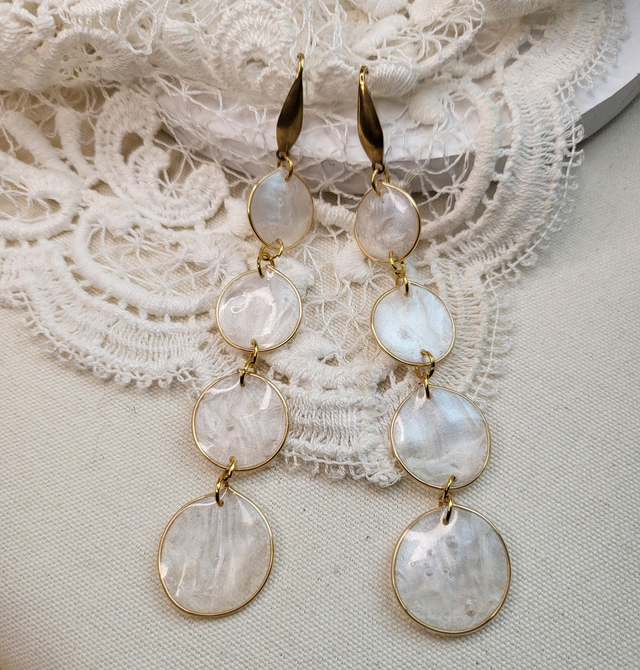Il se compose de trois petits ronds en fil de cuivre fin trempés artisanalement dans de la résine nacrée.