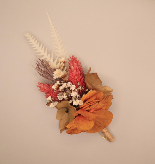 Délicatement façonnés à partir d’hortensia terracotta, de glixia blanc, de fougère blanche et de phalaris terracotta, ces accessoires allient la douceur du blanc à la chaleur enveloppante du terracotta.