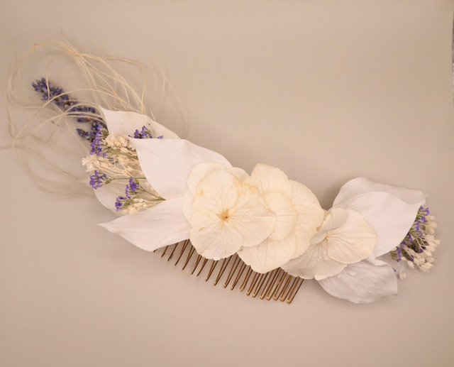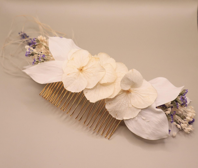 Ce grand peigne doré est une pièce délicate et poétique, ornée de fleurs stabilisées aux teintes douces. L'ensemble mêle harmonieusement le blanc pur et les nuances lavande, pour un accessoire raffiné, idéal pour une coiffure nuptiale élégante, bohème et romantique.