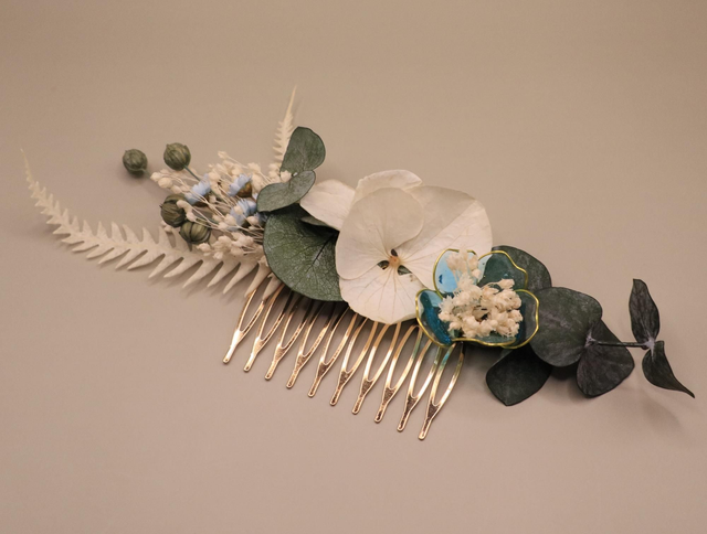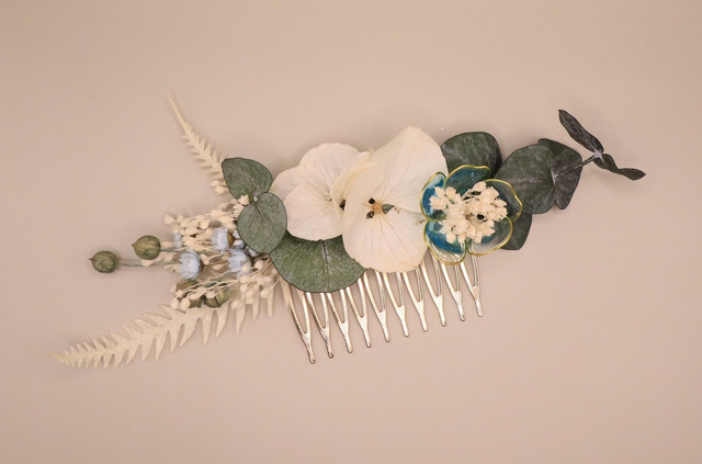 Peigne orné de fleurs séchées et stabilisées dans des teintes naturelles et douces : blanc ivoire, eucalyptus vert profond, petites touches de bleu pastel et fleur en résine bleu canard soulignée de doré. L’ensemble mêle finesse végétale et travail de résine pour une pièce délicate et contrastée. Parfait pour une coiffure de mariage romantique, bohème, champêtre.