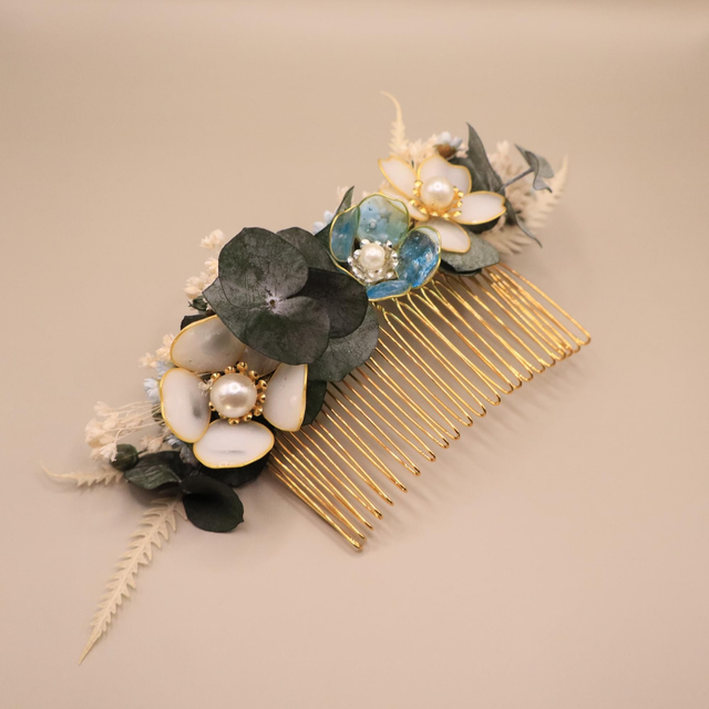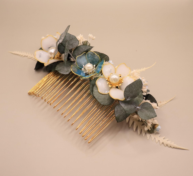 Laissez-vous séduire par l’élégance intemporelle de ce peigne délicatement orné d’un mélange raffiné de fleurs stabilisées et de fleurs en résine. Monté sur une base dorée, il marie harmonieusement l’authenticité de feuillages et de petites fleurs naturelles préservées à la finesse de fleurs en résine.