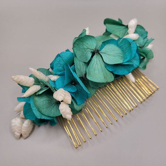 Le peigne est composé de fleurs stabilisées et séchées (hortensia et briza). Les fleurs ont été minutieusement sélectionnées pour créer un peigne unique et harmonieux. Cet accessoire s'accorde naturellement avec l'esprit bohême et l'univers champêtre des mariages empreints de douceur et d'authenticité.