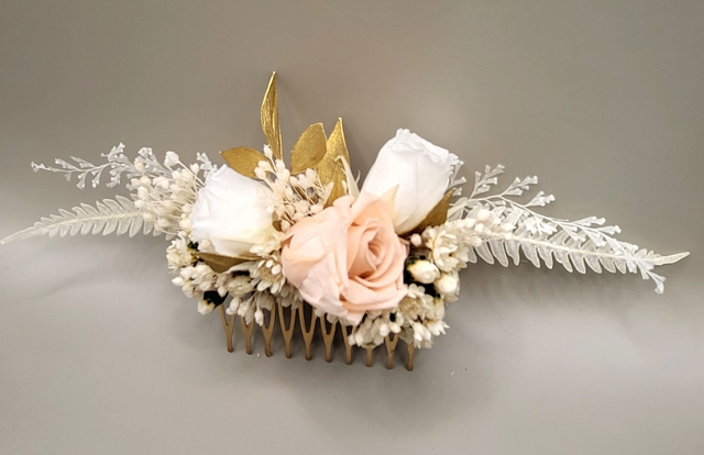 Le peigne est composé de roses stabilisées et fleurs séchées (Glixia, bouton d'ixodia, fougère, ruscus doré et gypsophile). Les fleurs ont été minutieusement sélectionnées pour créer un peigne unique et harmonieux. Cet accessoire s'accorde naturellement avec l'esprit bohême chic et l'univers champêtre des mariages empreints de douceur et d'authenticité.