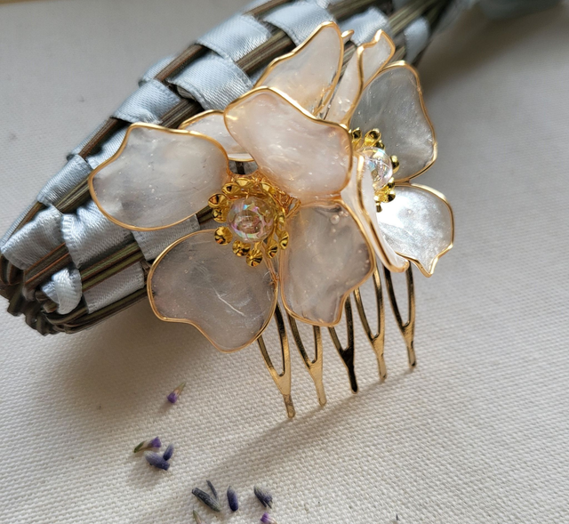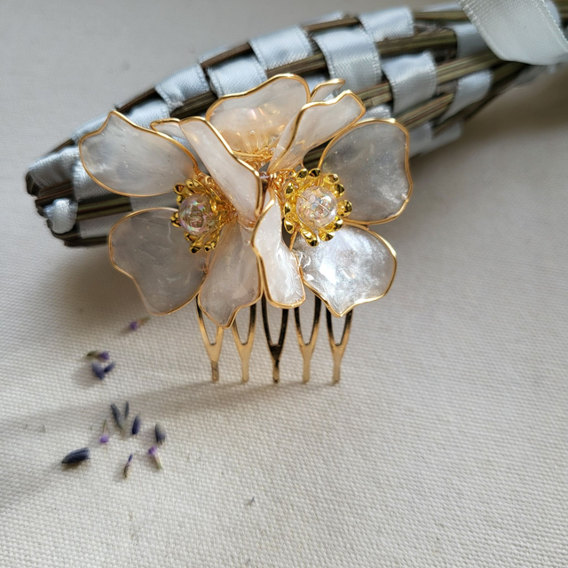Accessoire cheveux pour la mariée, ou le cortège, ce petit peigne est composé de 3 fleurs en résine nacrées, délicatement façonnées à la main et pensées comme de précieux ornements pour accompagner les coiffures de mariage avec élégance et douceur.