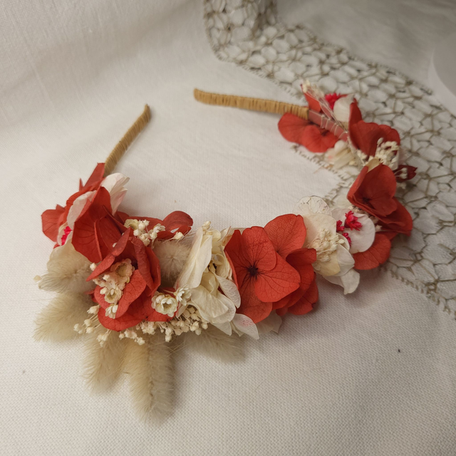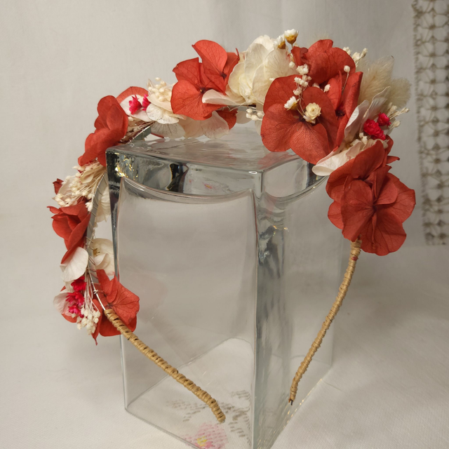 Apportez une touche de chaleur et d'élégance naturelle à votre coiffure avec ce serre-tête orné de véritable fleurs stabilisées dans des tons rouge et blanc. Chaque fleur est minutieusement disposée pour créer une harmonie entre douceur et caractère.
