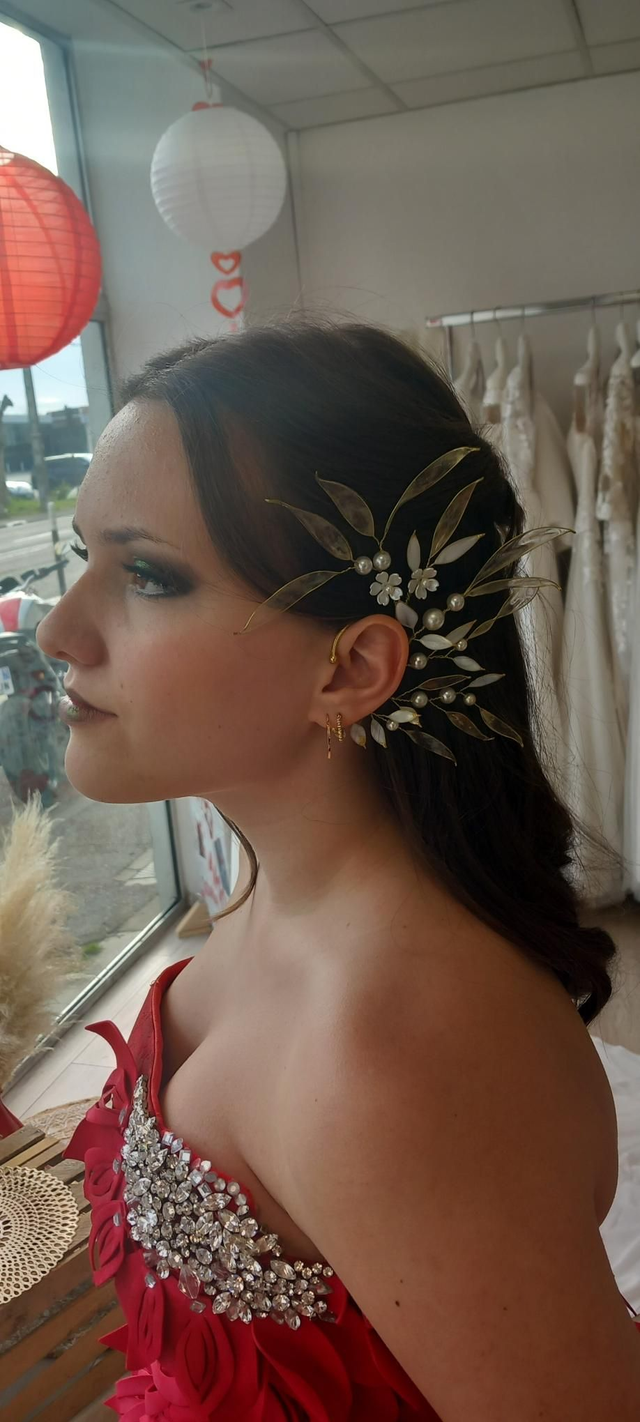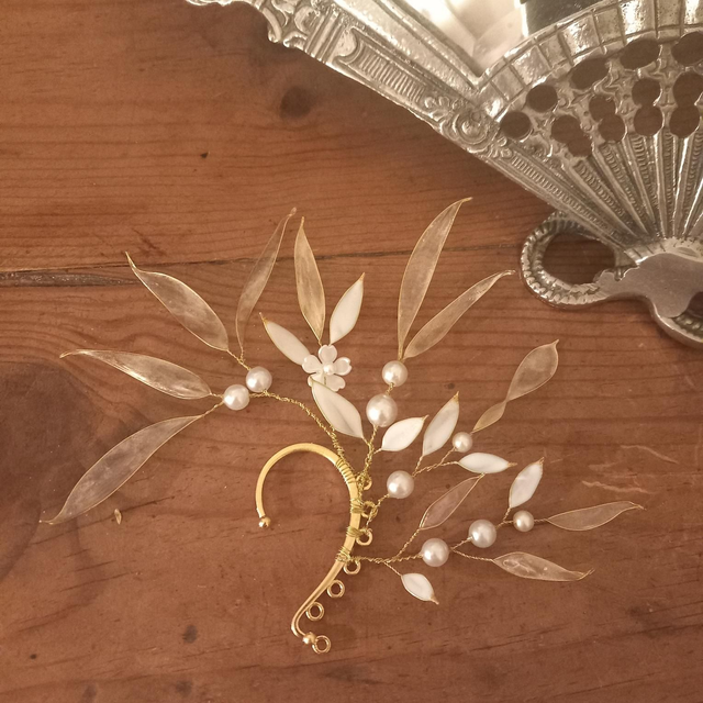 Élégant et aérien, il s’enroule autour de l’oreille sans besoin de perçage, comme un éclat de magie glissé dans une tenue de cortège, cérémonie, cocktail ou festival. Se porte à gauche.